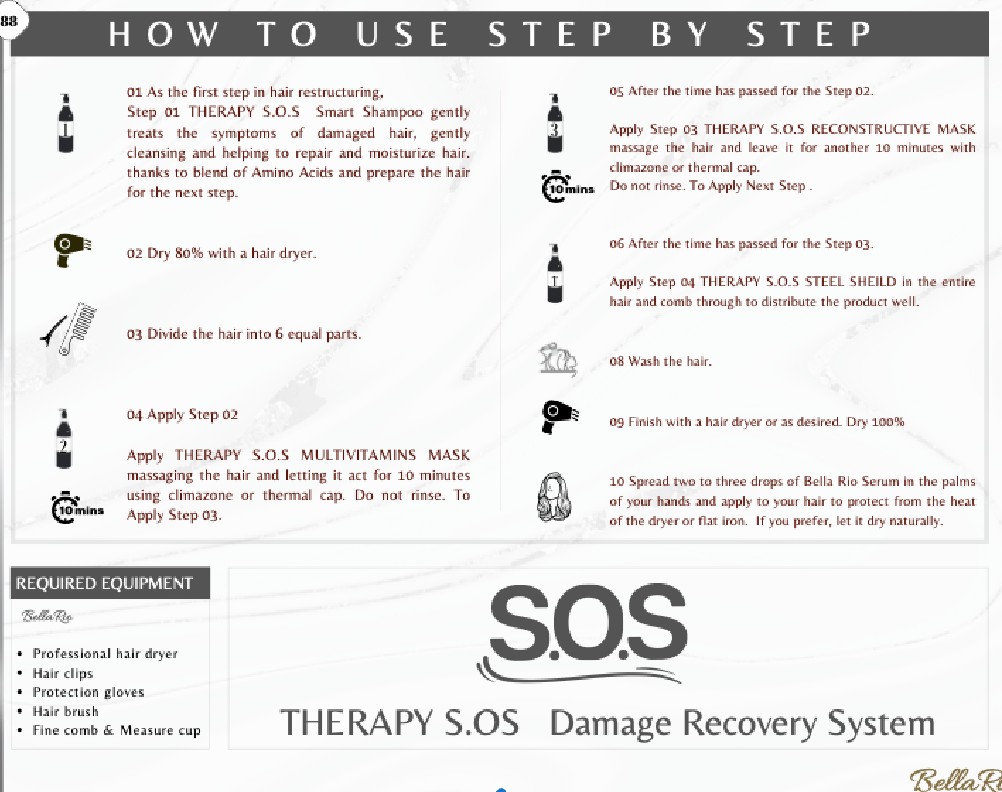 THERAPY S.O.S that seals the cuticle and balance the pH value. with the Exclusive association of the properties of the keratin together with oil of Macadamia, Sesamum seed oil and blend of Amino Acids. To Repair damaged and Elastic hair. Hair up to 100%. Preserve all the nutrients in the hair. Can also be used as an S.O.S product for damaged hair.